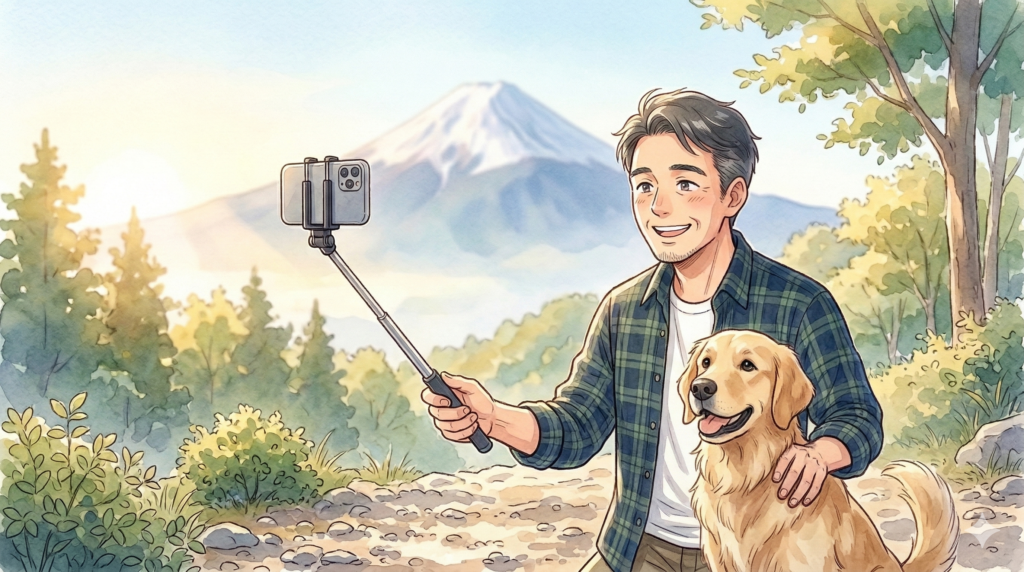 今回は『全身の雰囲気がわかる写真』を複数用意、自撮り感を消すために自撮り棒を担いで富士山周辺まで遠征してきました。